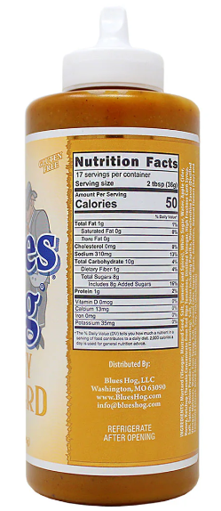 Blues Hog Honey Mustard Sauce is a thick, golden gourmet sauce that starts with the zesty taste of prepared mustard and finishes with the sweet taste of honey. The exotic blend of spices nurtures the natural flavors of smoked meats.