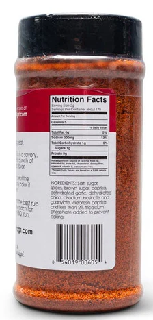 Ingredients: Salt, sugar, spices, brown sugar, paprika, dehydrated garlic, dehydrated onion, disodium inosinate and guanylate, oleoresin paprika and less than 2% tricalcium phosphate added to prevent caking.